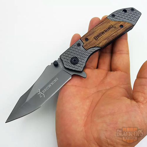 Sua lâmina é lisa, feita em aço inoxidável, com belíssima inscrição “Browning”.